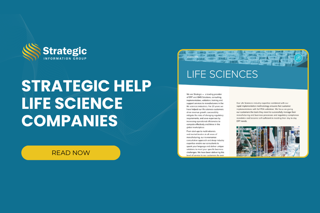 Strategic’s Life Sciences industry expertise combined with our rapid implementation methodology ensures fast customer implementations with full FDA validation. We focus on giving our customers the tools they need to successfully manage their manufacturing and business processes and regulatory compliance mandates and become self-sufficient in meeting their day to day needs.